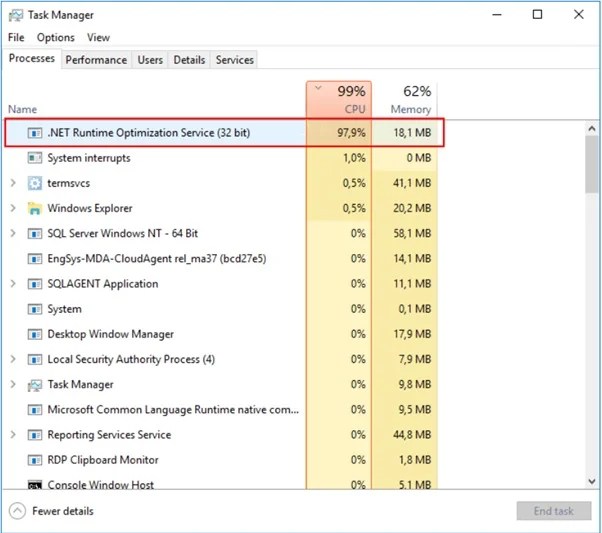 Microsoft also states that the process shouldn't take more than a couple of minutes. 06/11/2021 · the reason behind the high cpu usage by the.net runtime optimization service can be a specific software. The.net runtime optimization service runs too slowly on your pc. 14/05/2019 · what causes the.net runtime optimization service high cpu usage? And the following has summarized some other reasons for the.net runtime optimization service high cpu usage. If you think that this is the case, you can try performing a clean reboot of the system. The official answer is that the process needs to recompile its libraries and that it should only run when the computer is idle. But if you are experiencing long delays or slow processes, you will see high cpu usage in … 21/07/2020 · normally the.net runtime optimization service will not cause high cpu but if the optimization process takes too long, it may cause high cpu usage. 06/07/2019 · but for some of you, the truth is high cpu showing up by net runtime optimization service in task manager, which sometimes brings forth high gpu as well. .net runtime optimization service is a component of the windows operating system, which is also known as mscorsvw.exe and used to optimize the system by helping it start apps and programs faster. Regarding what causes mscorsvw.exe high cpu on windows 10, 8, 7, the main culprits are the net optimization task itself and some problematic applications on your pc. This will make sure that only necessary windows services are running and not any of the services of some application.